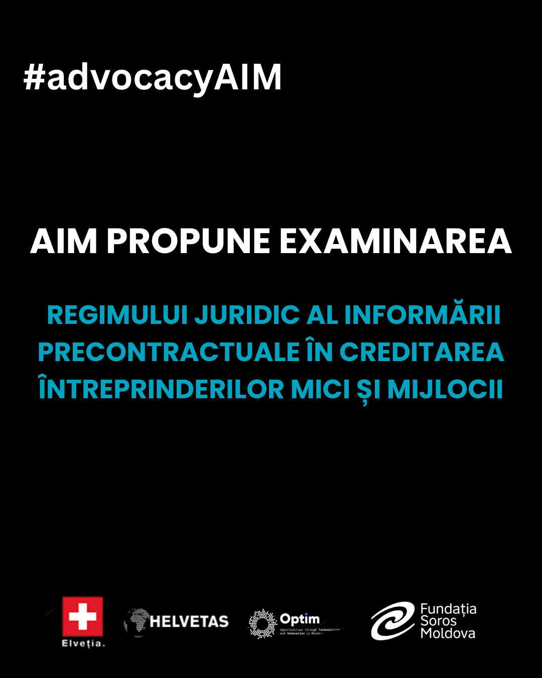 Pe 15 decembrie 2025, Alianța Întreprinderilor Mici și Mijlocii din Moldova (AIM) a transmis un demers către Ministerul Dezvoltării Economice și Digitalizării, Ministerul Finanțelor, Banca Națională a Moldovei, Comisia Națională a Pieței Financiare și Consiliul Economic pe lângă Prim-ministrul Republicii Moldova, privind examinarea regimului juridic aplicabil informării precontractuale în procesul de creditare a întreprinderilor mici și mijlocii (IMM).
